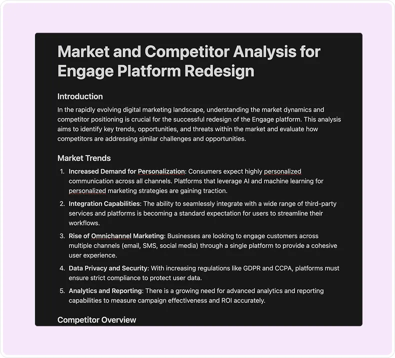 Instead of conducting traditional user interviews or usability tests, the primary source of product insight came from the product requirements document (PRD), internal team testing & feedback, plus analysis of competing tools in the marketing automation space.